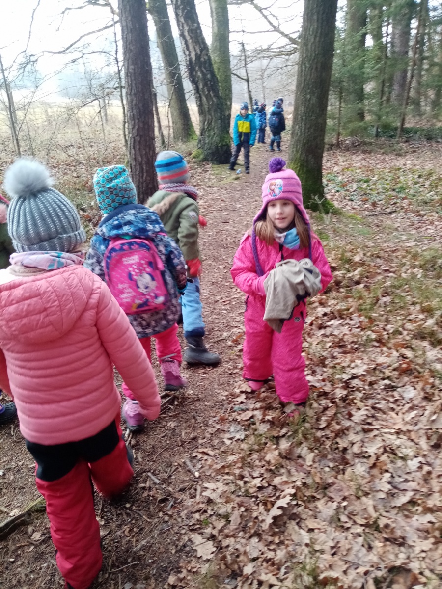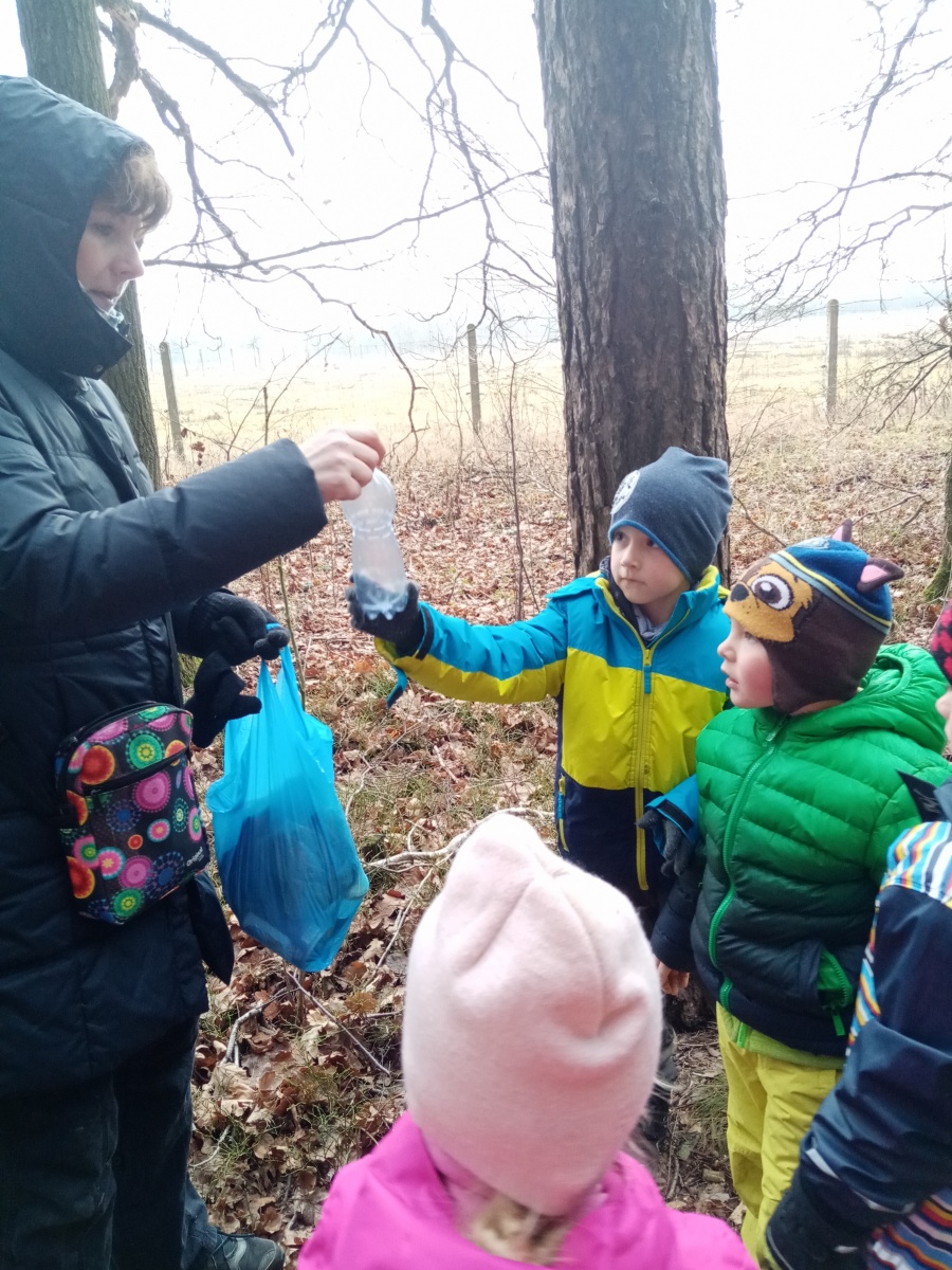 Dnešní ráno bylo mrazivé. Sluníčku se zpod mraků nechtělo, a tak se teplota držela stále pod bodem mrazu. Pocit chladu ještě umocňoval ledový vítr. Posilněni svačinkou nás čekal úkol. Na vytčené trase jsme měli 10 předmětů, které do přírody nepatří. Každý sám prošel trasu a měl za úkol zapamatovat si co nejvíce z předmětů, které byly na trase umístěny. Někomu se dařilo lépe, někomu méně. Rekordmanem byl Lukášek M., který si zapamatoval 8 předmětů! Pak jsme předměty posbírali, pojmenovali a určili, kam bychom je správně vyhodili. Ještě chvilku jsme si v lese pohráli. Ale nakonec nás zima z lesa vyhnala. Teploučký a dobrý oběd nám byl příjemnou odměnou.