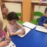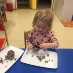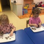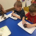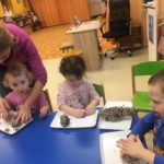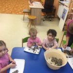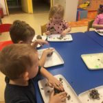 Protože nám tentokrát počasí nepřálo, využili jsme toho k tvoření krmítek pro ptáčky. K vyrábění děti použily borové šišky a směs semínek se sádlem. Práce to byla velice příjemná na dotek a hezky si děti tím procvičily jemnou motoriku. Když se počasí umoudřilo a prudký déšť přestal, šli jsme krmítka rozvěsit ptáčkům po školkové zahradě.