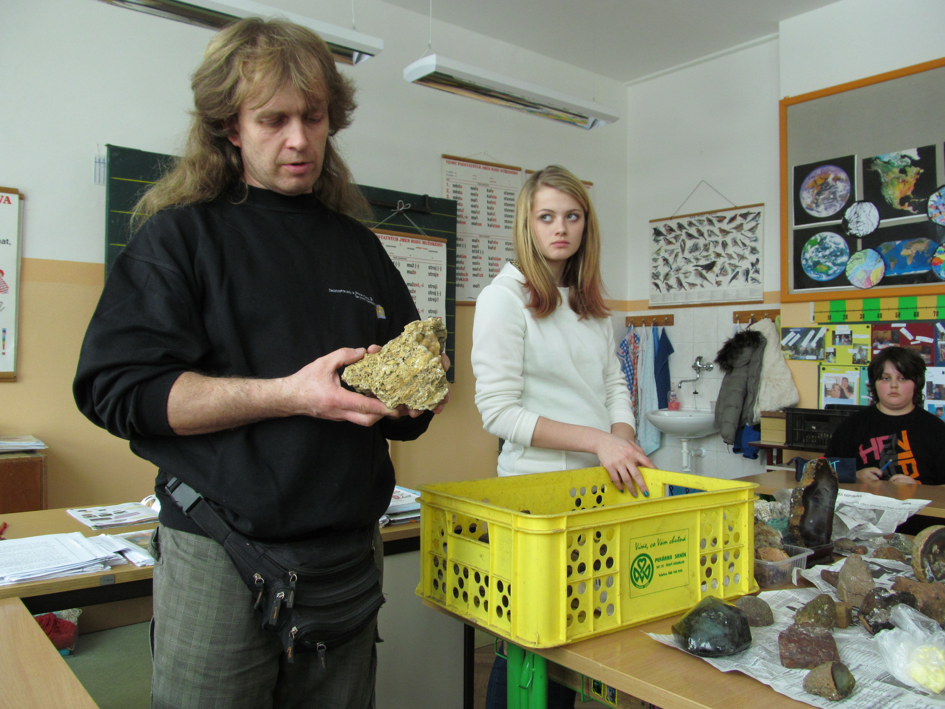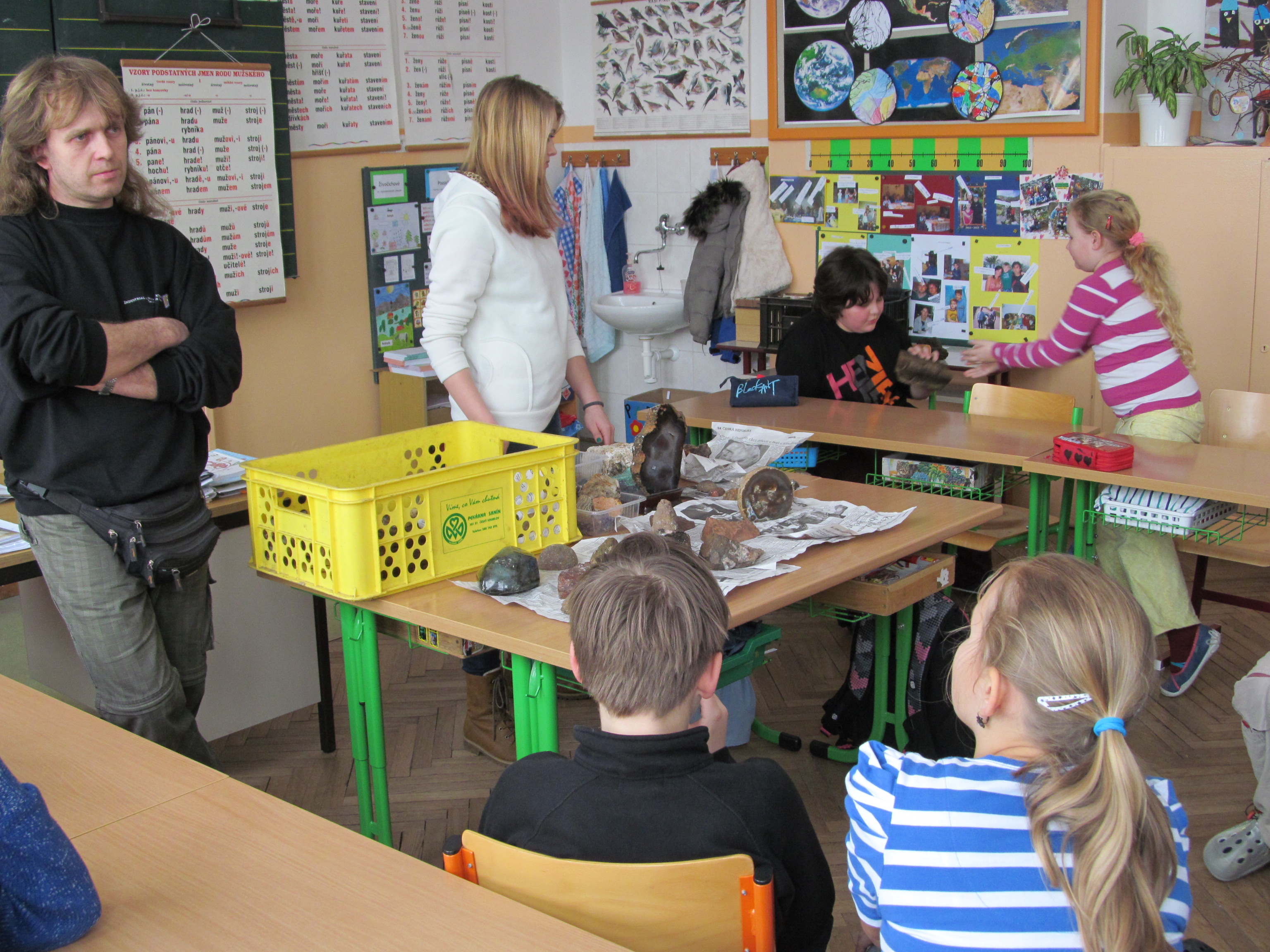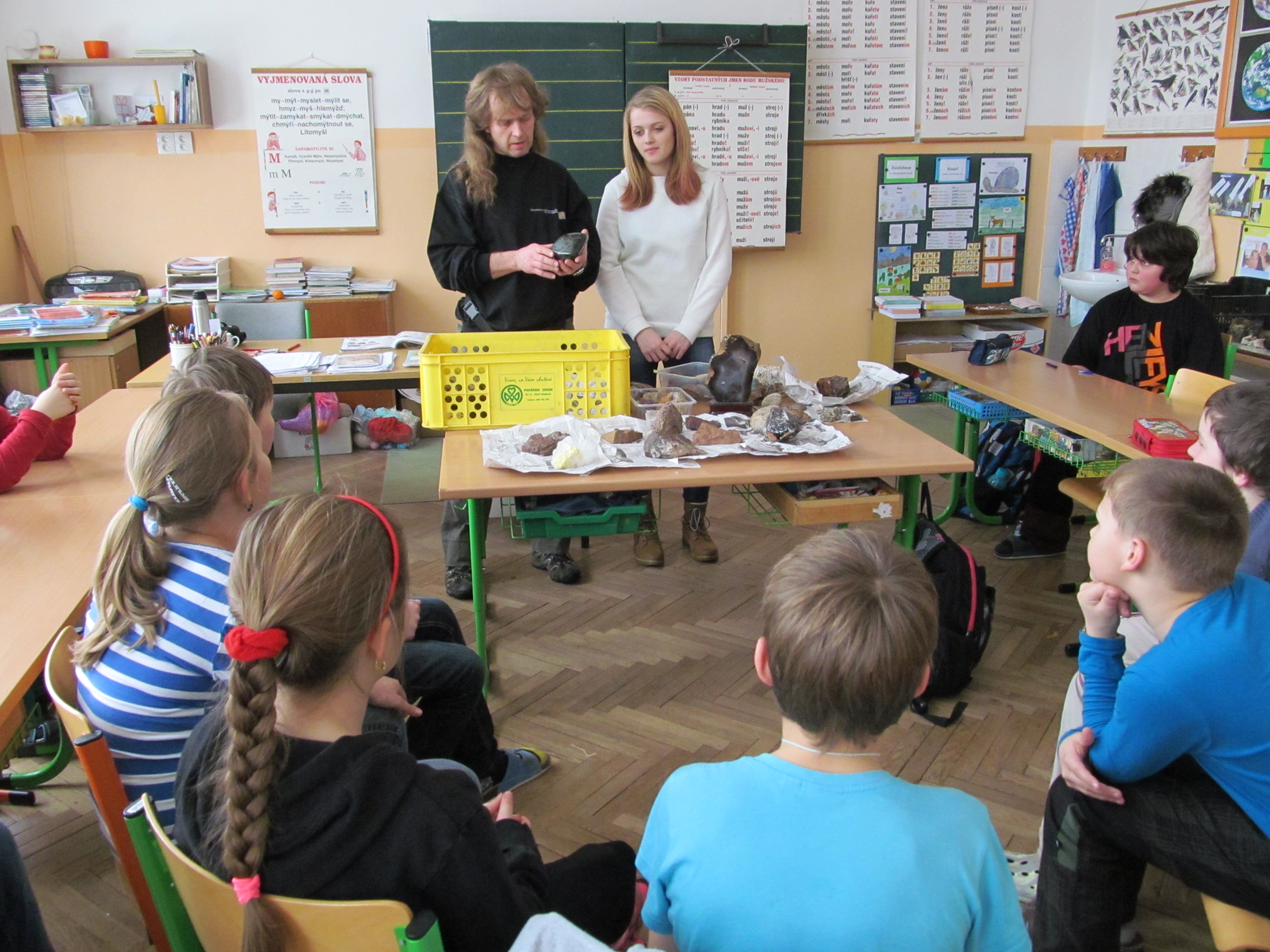 Pozvání do školy na hodinu přírodovědy přijal vášnivý sběratel hornin a minerálů pan Jiří Koudelka z Bednárce. Ukázal dětem některé exempláře ze svých sbírek a poutavě vyprávěl o tom, jak a kde které minerály získal. Žáci měli možnost si všechny nerosty prohlédnout na vlastní oči a také je vzít do ruky. Dozvěděli se o vlastnostech těchto nerostů. Asistentkou pana Koudelky byla jeho dcera Martinka Koudelková. Oběma patří náš velký dík!