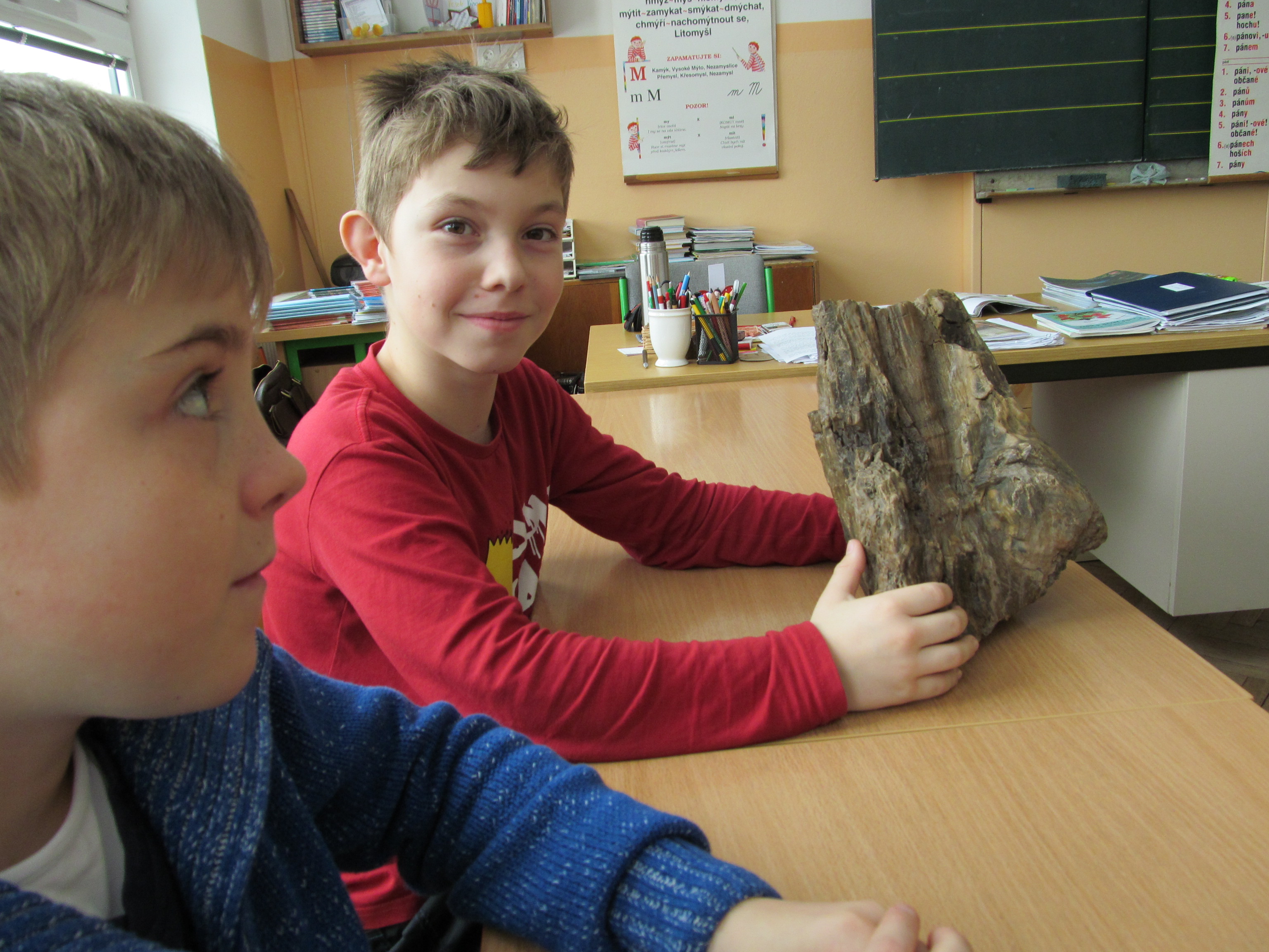 Včera jsem se dozvěděl, že na světě existuje kamenné dřevo. Pán tam měl zkamenělé dřevo a říkal, že polovinu z těch kamenů našel na poli v Bednárci. A že před jeho domem je malá jeskyňka, ve které rostou dva krystaly naproti sobě. Měl tam i rozříznutý kámen, který uvnitř vypadal moc pěkně. Byl jsem šťastný a moc se mi to líbilo. (Kuba)