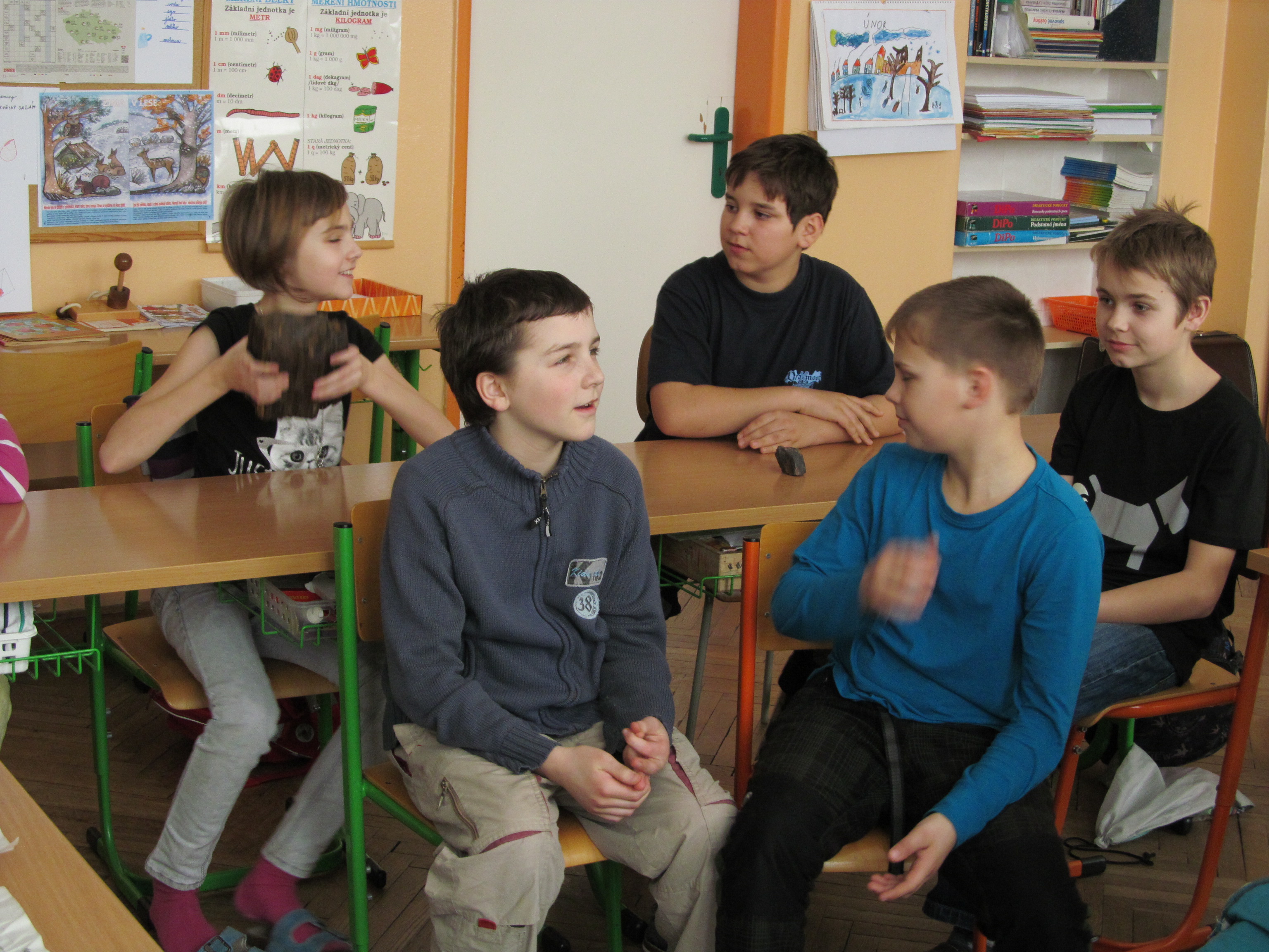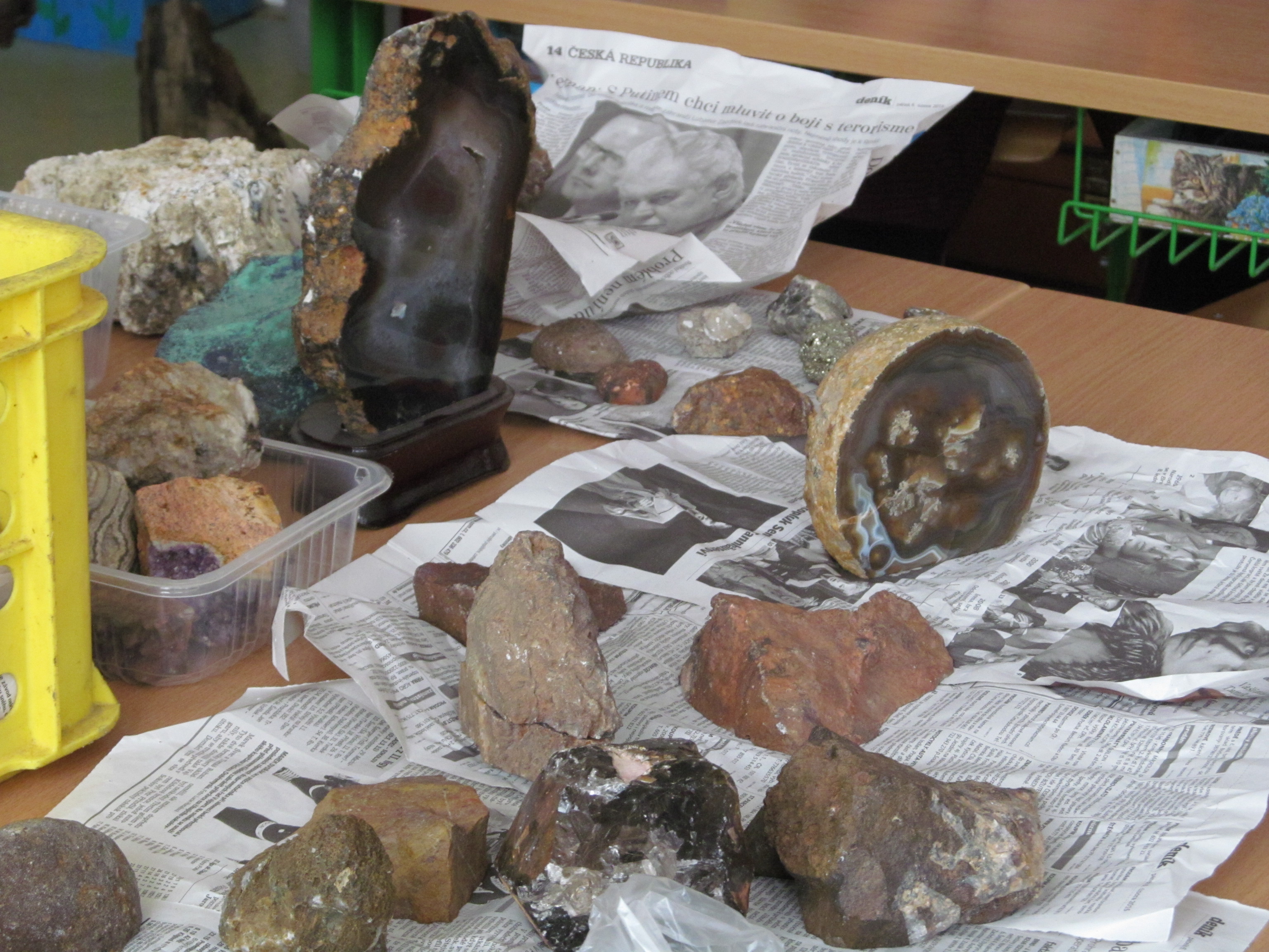 Povídali jsme si o kamenech a posílali jsme si je. Byly tady různé druhy kamenů, jako třeba rutil, opál, ametyst. Koudelkovi měli hodně kamenů a říkali, že jezdí po trzích. A prý jsou nějaké kameny u Třebíče na poli a taky tam je zkamenělé dřevo. Měli tady i kameny, na kterých byly krystaly. Na konci jsme si mohli vybrat kámen opál a zkamenělé dřevo. (Natálka)